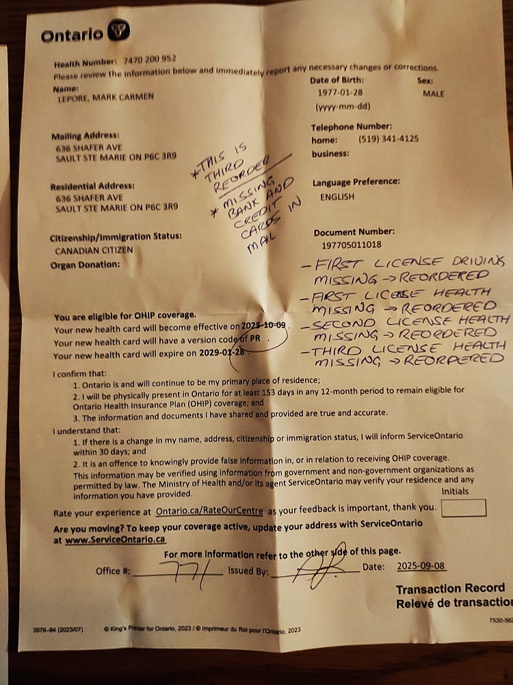 ________________________________________________________ GOVERNMENT IDENTIFICATION GOING MISSING ALLOWING FOR FRAUDULENT TRANSACTIONS. HOW IS IT THAT IDENTIFICATION WHICH GRANTS ACCESS TO BANK ACCOUNTS ARRIVES THROUGH STANDARD MAIL, EASILY STOLEN, CANNOT BE TRACKED, MANAGED, OR INVESTIGATED WHEN MISSING? SUCH AN IMPORTANT PIECE OF IDENTIFICATION YET THERE IS ZERO CARE TAKEN IN ITS DISTRIBUTION. CANADIAN "AUTHORITIES" COMPLACENT, AGAIN CONTRIBUTING TO TRUST FRAUD LAW FRAMEWORK SCHEME AND STEALING IDENTIFICATION FROM INNOCENT CITIZENS -