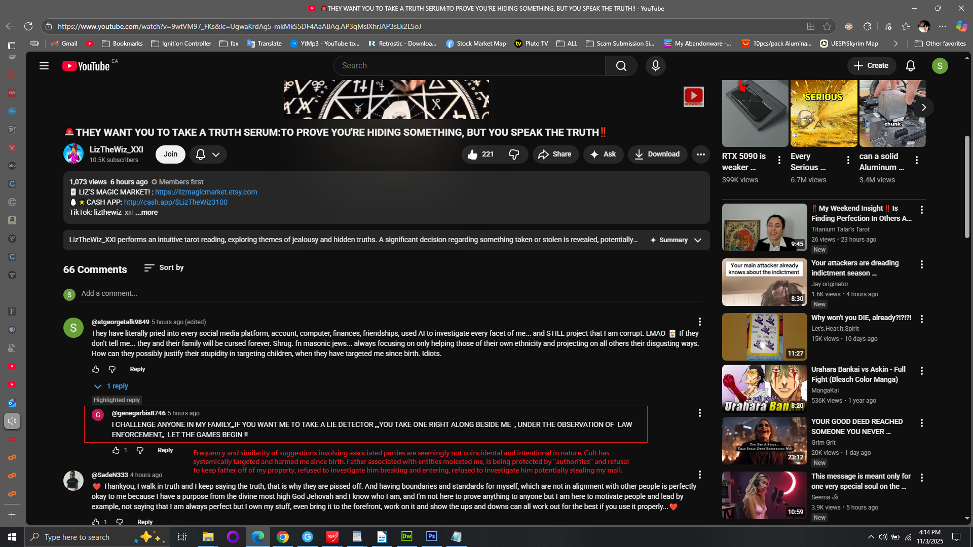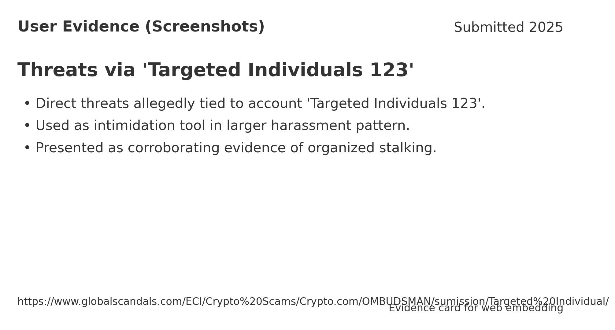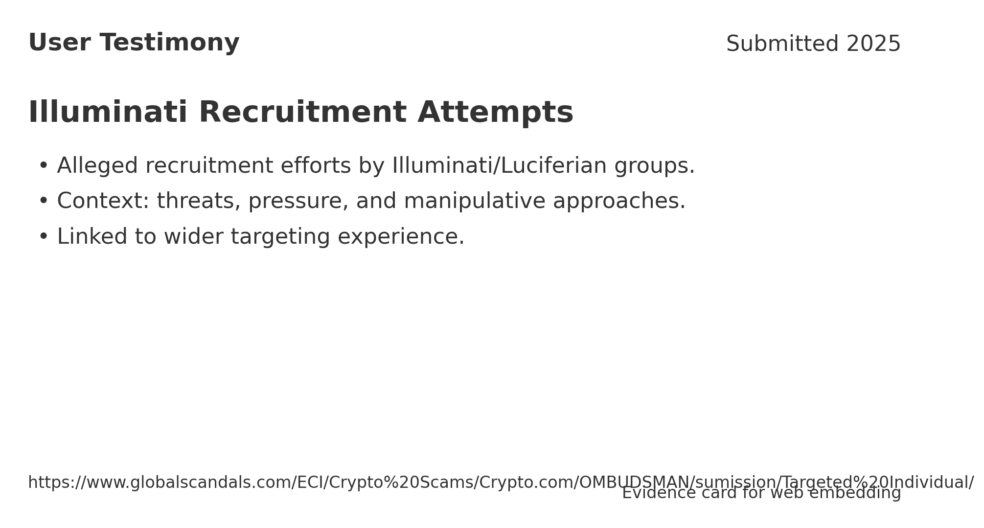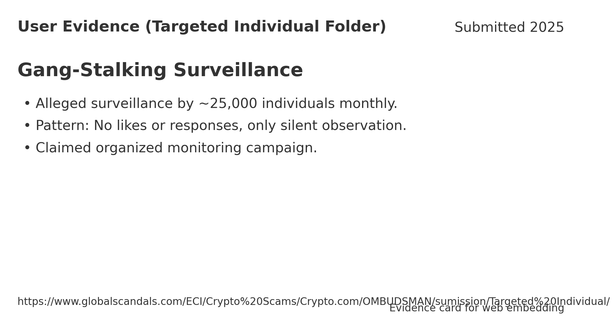 ________________________________________________________ Allegations include surveillance by ~25,000 individuals/month watching my social media, recruitment attempts by Illuminati/Luciferian groups, and threats via “Targeted Individuals 123.”